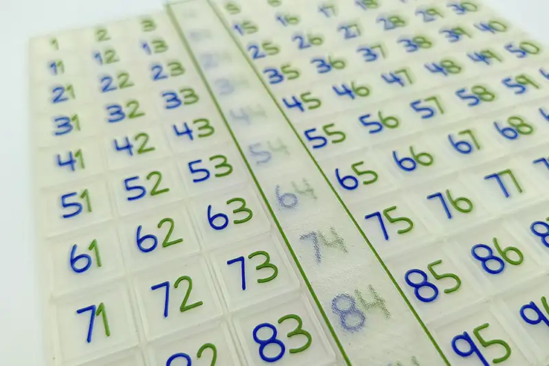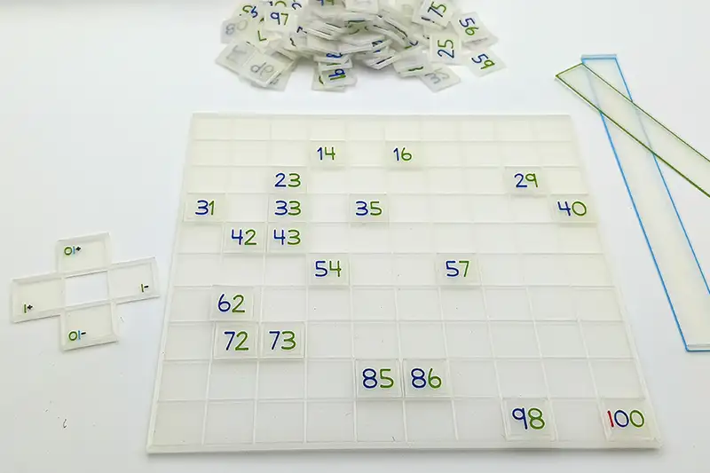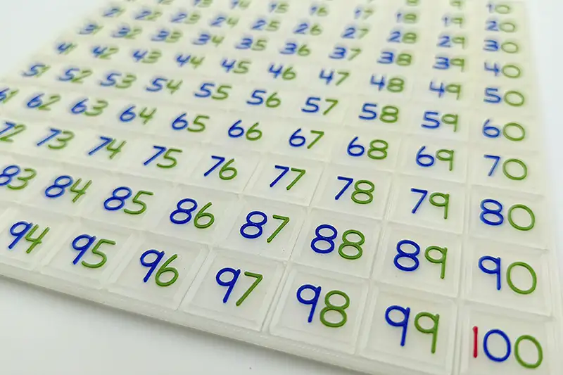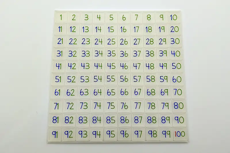 La tabla del 100 es un material educativo basado en matemáticas ABN, la tabla del 100 de Sumando Momentos es un tablero transparente de 10×10 donde podrás colocar los números del 1 al 100. Los números de la tabla del 100 también son translúcidos y los números tienen la unidad en azul, la decena en rojo y la centena en verde.