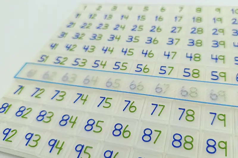 - Los números están impresos en color transparente en su base y los números en colores Montessori, azul la unidad, rojo la decena y verde la centena.